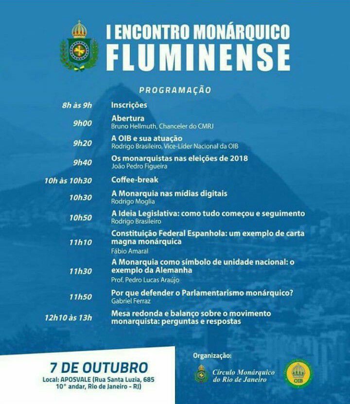 As 11h50, Gabriel Ferraz traz o tópico “Por que defender o parlamentarismo monárquico?”, e de 12h10 às 13h acontece uma mesa redonda com um balanço geral sobre o evento e as perspectivas do movimento monarquista. O endereço para os interessados é Rua Santa Luzia, 685, 10º andar, Rio de Janeiro, RJ.