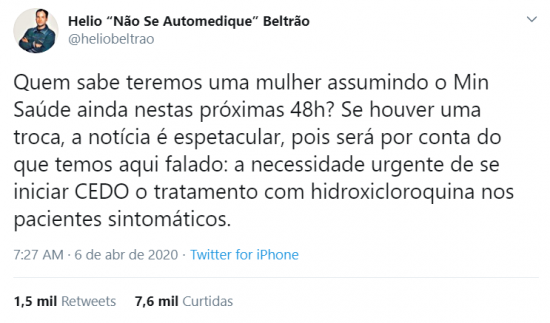 “Quem sabe teremos uma mulher assumindo o Ministério da Saúde ainda nestas próximas 48h? Se houver uma troca, a notícia é espetacular, pois será por conta do que temos aqui falado: a necessidade urgente de se iniciar cedo o tratamento com hidroxicloroquina nos pacientes sintomáticos [de Covid-19]”, escreveu.