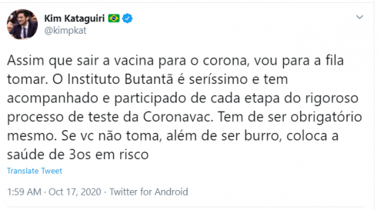 Já o deputado Kim Kataguiri (DEM-SP), egresso do Movimento Brasil Livre, afirmou que tomará a vacina assim que for aprovada: “O Instituto Butantã é seríssimo e tem acompanhado e participado de cada etapa do rigoroso processo de teste da Coronavac. Tem de ser obrigatório mesmo. Se você não toma, além de ser burro, coloca a saúde de terceiros em risco”, alegou.